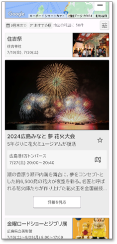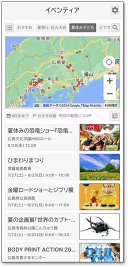 - 地図を使って、“現在地近く”“目的地周辺”のイベントをビジュアルに把握可能。